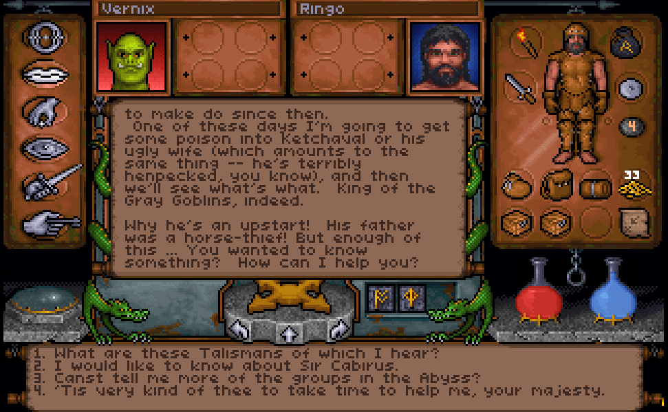 Jen pro info - král zelených goblinů se jmenuje Vernix, král šedých goblinů Ketchaval, který je ale silně pod pantoflem a promluví se mnou až po té, co získám povolení od jeho ženy, královny Retichall. Zelení goblini se pasují do těch hodných, nenávist k šedým vznikla po té, co Sir Cabirus zemřel a šedí goblini údajně vykradli zelené. Odkaz Sira Cabiruse může být obnoven jen získáním osmi ctností (Virtues), jsou to artefakty či talismany, které se po jeho smrti ztratily.